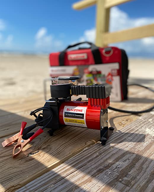 The BLIKZONE Roadside Emergency car kit Aqua 81 Pc Emergency car kit is the perfect choice for anyone looking to ensure their preparedness for any unexpected roadside event. This comprehensive kit includes an air compressor with a 25 LPM capacity and is powerful enough to inflate car and bike tires and other inflatables. It has heavy-duty #8 gauge battery jumper cables to jump-start the vehicle in case of battery failure and a 19-piece circuit tester tool for troubleshooting vehicle electrical systems. All items fit neatly into a durable, high-quality bag.